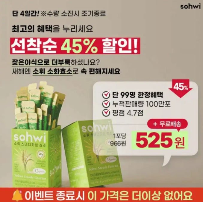 소화가 안되어 더부룩할땐 참지말고 소휘효소 하세요! 밥,빵,면 먹고 식후 1포면 속이 편안해요! ⏰단 4일만 1+1 수량소진시 조기종료! 어제 먹은 야식, 과식 죄책감 싹 분해! OOOO의 섭취가 외국 대비 3배 이상 많은 식습관을 가진 한국인은 외부섭취를 통한 효소 보충은 선택이 아닌 필수 입니다. 식후 1포 습관으로 속편해지세요! 여기서OOOO은?