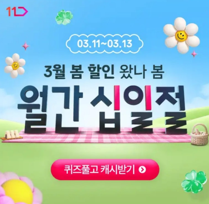 11번가 캐시워크 돈버는퀴즈 봄바람 타고 살랑~ 다가온 3월 한정 패밀리플러스 혜택! 3월에만 7% 할인과 2천 적립 혜택 둘 다 드리니까 지금 패밀리플러스 평생 00 시작하기! 00에 들어갈 단어는 무엇일까요? (초성힌트: ㅁㄹ)