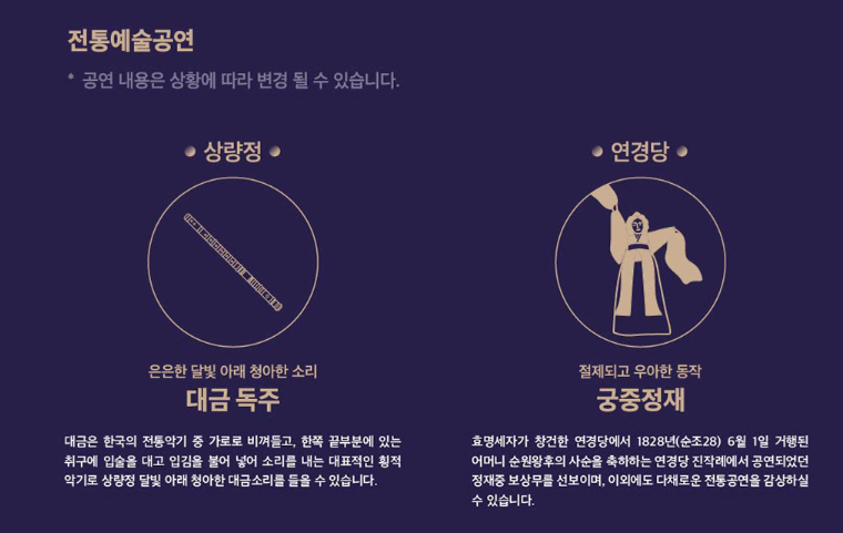- ✅ 전통예술공연 : 대금독주, 궁중정재