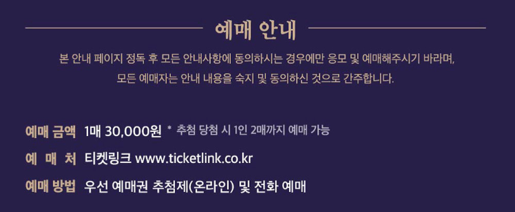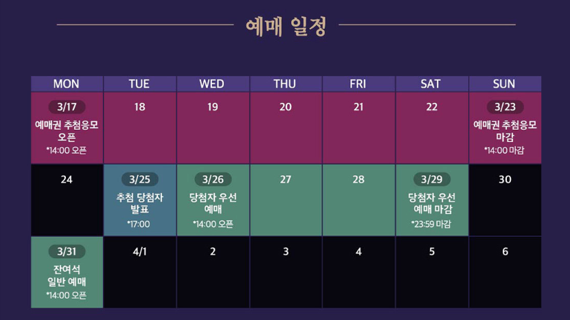 - 당첨자 대상 예매기간 : 2025년 03월 26일(수) 14:00 ~ 03월 29일(토) 23:59