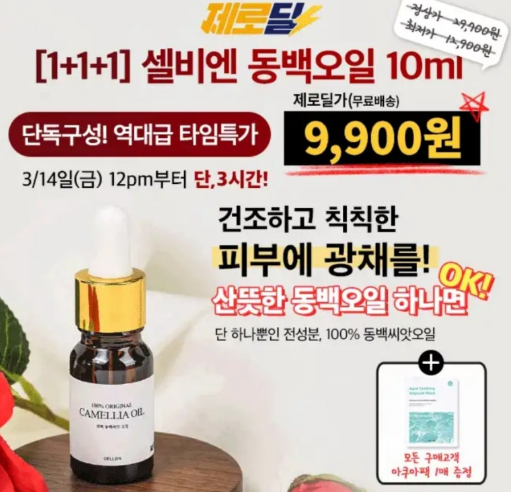 단 3시간, 제로딜 단독구성 최저가! 자연 그대로의 화장품을 지향하는 000의 100% 동백씨앗오일은 인공첨가물없이 단 하나의 전성분으로 머리부터 발끝까지 사용가능한 멀티오일이며, 건조하고 칙칙한 피부에 높은 보습력으로 피부 보호막을 형성하여 유수분 밸런스조절, 윤기가득 진짜 보습 오일 제품입니다. 빈칸에 들어갈 브랜드 이름은 무엇일까요? (힌트: ㅅㅂㅇ)