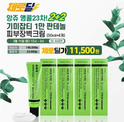 역대급 특가! 4개 11,500원+무료배송! 앙쥬 리페어 크림은 50ml 1+1+1+1 구성으로 판테놀 및 센텔라 성분이 OOOOOppm 고농축 함유되어 있어, 피부장벽을 강화하여 탄력있는 피부로 만들어 줍니다. 미백과 주름개선에 완벽한 리페어 크림으로 다음중 빈칸에 들어갈 숫자는 무엇일까요?