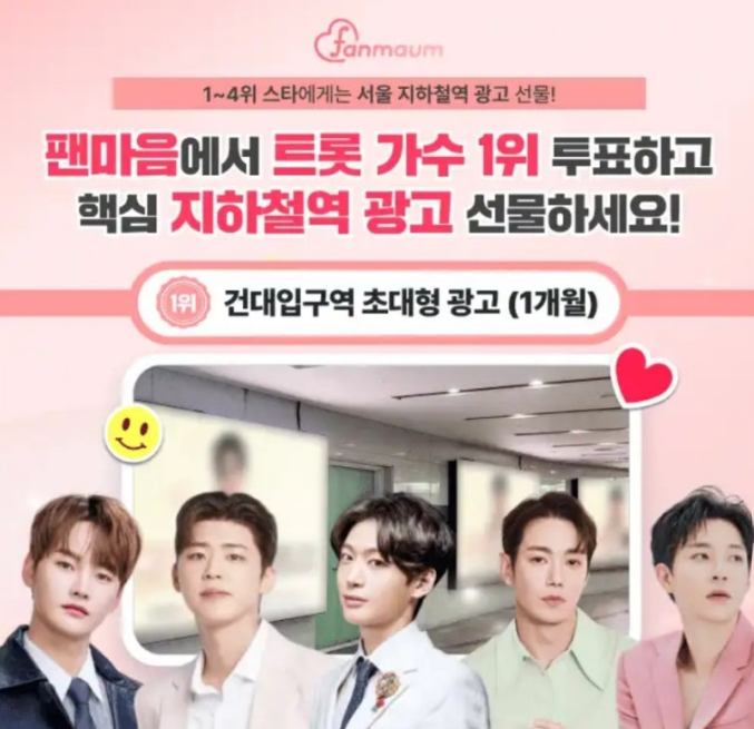 팬마음 트로트 스타 35차 투표 1위 스타에게는 하루 유동 인구 30만 명인 건대입구역에 OOOOO 광고를 1개월 동안 해드려요!