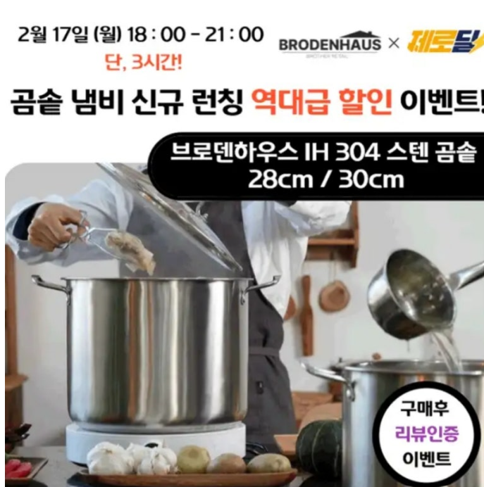 단 3시간 동안 진행되는 "캐시딜 타임특가에서 브로덴하우스 신규 런칭이벤트로 브로덴하우스 스텐 곰솥냄비 28/30cm가 역대급 할인중인데요. 이 곰솥냄비는 깊이가 깊~고 재질이 스텐000 재질로 되어있어 내구성이 좋고 위생적입니다. 인덕션도 가능한 냄비! 000에 들어갈 숫자는 무엇일까요?