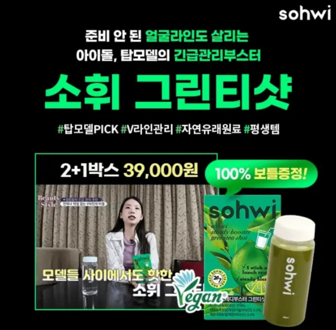 탑모델 V라인 관리템 소휘 그린티샷 "이미 모델들 사이에서 아이돌물은 긴급관리템으로 핫해요. 메이크업샵 쌤이 매일 아침 타주시거든요" 수량비상! 소진시 조기종료 "OOO 음식을 먹을때 함께 먹으면 개운하고 죄책감이 덜해요", "친구들이랑 여행와서 야식 먹은 다음날에도 인생샷 걱정 없어요" 소휘 그린티샷의 찐 고객 후기 입니다. 여기서 OOO은?