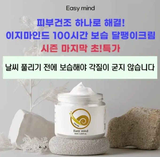 2,400여개의 네이버 후기가 증명하는 보습 끝판왕! 날씨 풀리기 전에 보습해야 각질이 굳지 않습니다. 시즌 마지막 초특가 행사할때 구매하세요! 이지마인드 달팽이크림은 임상시험을 통해 100시간 보습이 지속됨을 확인했습니다. 사용직후 478% 보습, 사용 100시간 이후에도 ㅇㅇㅇ%의 보습이 지속되는 달팽이크림! ㅇㅇㅇ안에 들어갈 말은 무엇일까요?