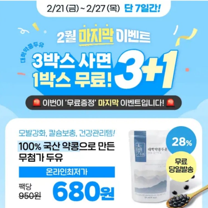 [진짜 마지막] 대학약콩두유 1박스 무료증정 & 온라인최저가 팩당 680원! 마지막 1박스 무료증정 이벤트가 종료되면 더이상 혜택을 받을 수 없으니 빠르게 만나보세요. 대학약콩두유는 약콩의 영양을 통째로! 첨가물 없이 더욱 건강하게 만들어 OOO O 그대로 섭취할 수 있습니다. 약콩두유의 영양을 온전히 느껴보세요! OOOO은 무엇일까요?