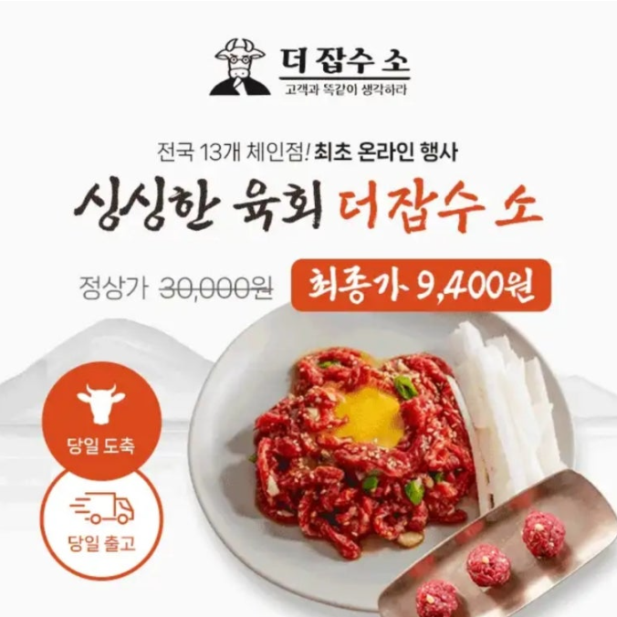 단 한시간동안 진행되는 "캐시딜" 타임특가에서 [온라인최초]★당일도축/ 0000 더 잡수소 육회/ 육사시미/뭉티기가 200g 9,400원부터 행사 진행됩니다. 더 잡수소는 전국에 13개 이상 직영매장이 있고 이미 경상도지역에서는 신선하고 맛있는 매장으로 유명하다고 합니다. 당일 도축으로 너무 신선해서 모두가 놀라는 더잡수소. 빈칸에 들어갈 글자는 무엇일까요?
