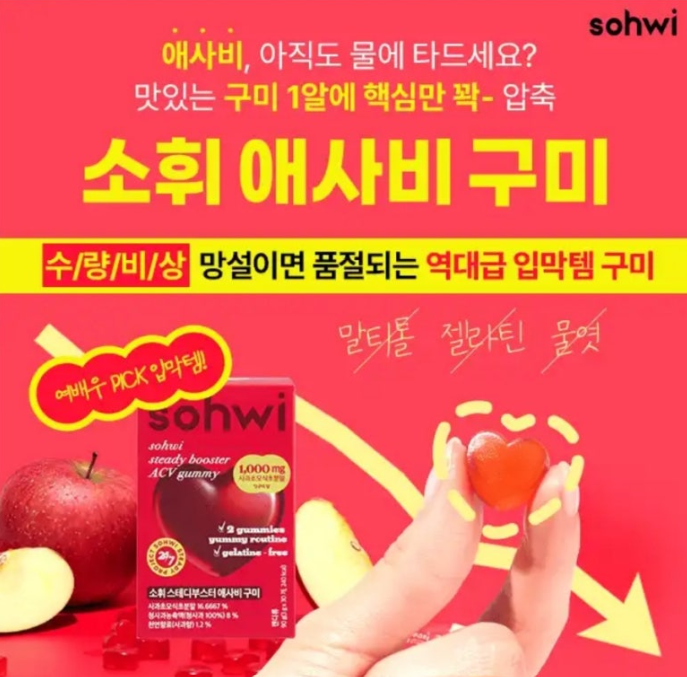 살찌는 설탕폭탄 군것질 대신 당류1g 애사비 구미로 바꿀게요! 수량비상 다팔리면 이가격은 없어요 지금이 쟁여둘 기회! 시큼 쿰쿰 애사비 아직도 코막고 억지로 드세요? 쫄깃 상큼한 구미 1알에 핵심만 꽉 채운 소휘 애사비 구미는 말티톨, 젤라틴, 물엿없이 유기농 애사비, 0000를 꽉 채운 <역대급 입막템> 비건인증 구미 입니다. 여기서 0000는?