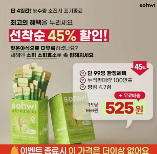 소화가 안되어 더부룩할땐 참지말고 소휘효소 하세요! 밥,빵,면 먹고 식후 1포면 속이 편안해요! 단 4일만 1+1 수량소진시 조기종료! 어제 먹은 야식, 과식 죄책감 싹 분해! OOOO의 섭취가 외국 대비 3배 이상 많은 식습관을 가진 한국인은 외부섭취를 통한 효소 보충은 선택이 아닌 필수 입니다. 식후 1포 습관으로 속편해지세요! 여기서 OOOO은?
