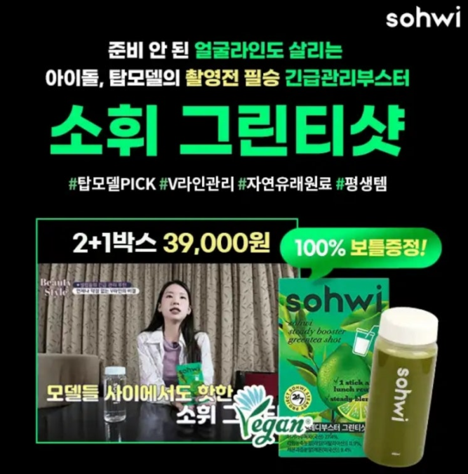 탑모델 V라인 관리템 소휘 그린티샷 "이미 모델들 사이에서 아이돌물은 긴급관리템으로 핫해요. 메이크업샵 쌤이 매일 아침 타주시거든요" 수량비상! 소진시 조기종료 "기름진 음식을 먹을때 함께 먹으면 개운하고 죄책감이 덜해요", "친구들이랑 여행와서 OO 먹은 다음날에도 인생샷 걱정 없어요" 소휘 그린티샷의 찐 고객 후기 입니다. 여기서 OO은?