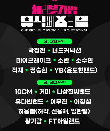 내용: 유명 가수들과 밴드들이 참여하는 뮤직 페스티벌로, 밤하늘을 수놓는 벚꽃과 함께 음악을 즐길 수 있는 시간입니다.