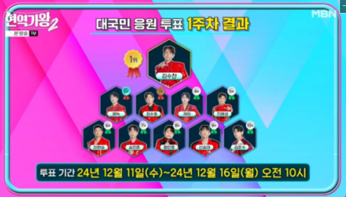 - 2위 김용빈 - '앉으나 서나 당신 생각' (현철): 특유의 매력으로 무대를 장악하며 1278점을 획득했습니다. "사람을 홀리는 재주가 있다", "대스타가 될 상"이라는 평을 받았습니다.