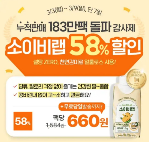 [단 7일] 누적 판매 183만팩 돌파 기념! 소이비랩 저당두유 58% 할인 & 팩당 660원 혜택 NO 설탕! 천연감미료 알룰로스로 달콤함은 그대로 유지했어요~ 소이비랩 저당두유는 이런분께 추천드려요. 간편하고 든든한 식사대용, OOOO 두유를 찾고 계신 분! 누적판매 183만팩을 돌파한 소이비랩을 바로 만나보세요! OOOO은 무엇일까요?