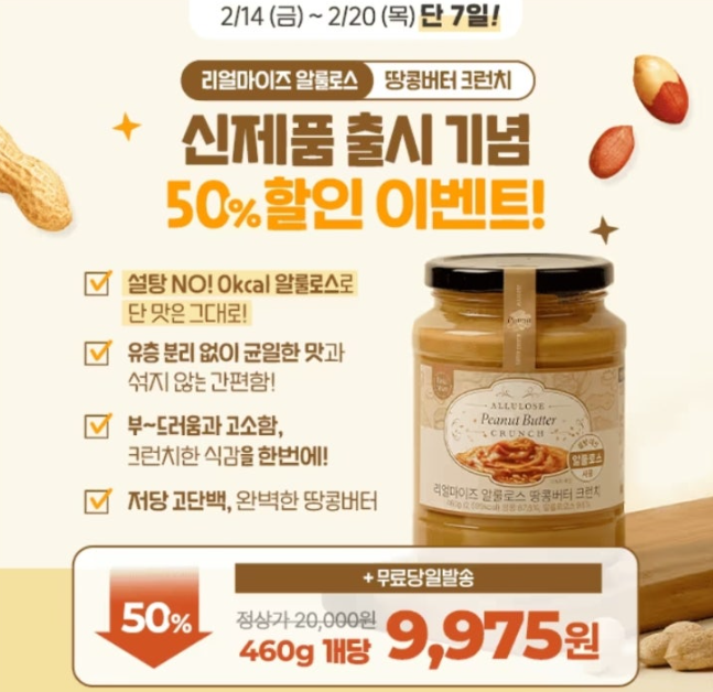 리얼마이즈 알룰로스 땅콩버터 크런치 출시 기념! 단 7일간 50% 특별 할인 진행! NO 설탕! 알룰로스로 단 맛은 유지한 저당 고단백 땅콩버터 신제품이 나왔어요! 리얼마이즈 땅콩버터는 어떤점이 특별할까요? 바로 OO OO 모두 챙긴 땅콩버터랍니다~ 부드러움과 고소함, 오독오독 씹히는 땅콩의 완벽한 조화까지 느껴보세요! OOOO은 무엇일까요?