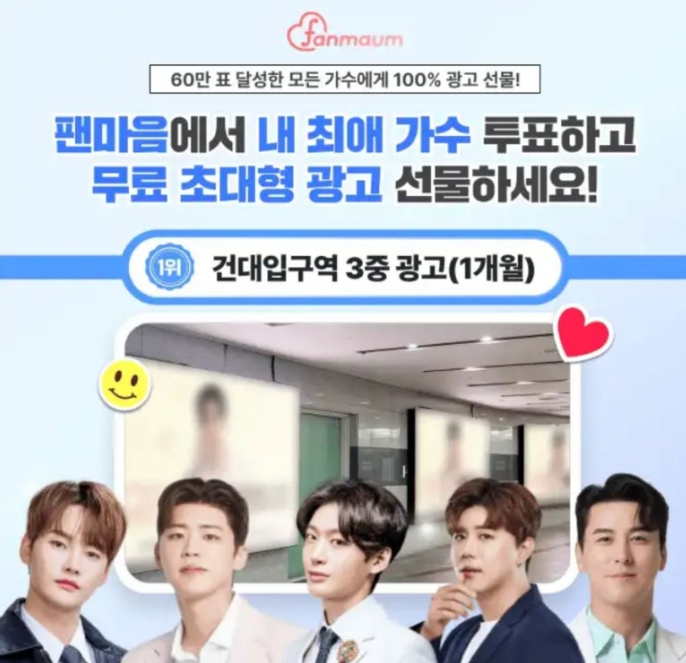 현재 팬마음에서는 OOOOO 남자/여자 투표 36차가 진행 중이에요! 이 투표에서 1-4위를 달성한 남녀 스타에게는 서울 지하철역 광고를 무료로 드려요!
