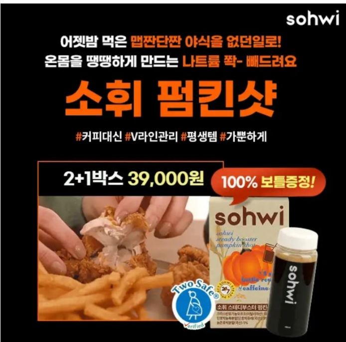 어제 또 못참고 잔뜩 먹고 잤나요? 걱정마세요 나트륨 쫙 빼드릴게요🔥 죄책감대신 날렵한 아침을 경험하세요! 단4일 한정수량 어제먹은 맵짠식단 걱정 끝내드릴게요! V라인 관리를 위한 소휘 펌킨샷은 하루1포 단 11칼로리로 숨어있는 OOO을 찾아드려요. 나트륨,수분은 빼내고 풍부한 식이섬유는 보충해 드려요. 커피대신 날씬하게 즐기세요. 여기서 OOO은?