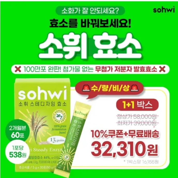 소화가 잘 안되세요? 효소를 바꿔보세요! 100만포 전량 완판 된 소휘 소화효소는 빠르게 먹고 적게 씹지만 밥, 빵, 면 등 OOOO 섭취가 절대적으로 많은 한국인의 식습관에 최적화 되어, 외부섭취를 통한 효소 보충이 꼭 필요합니다. 식후 1포 습관으로 속 편한 하루 되세요! 지금 여기서만 최저가 + 10% 쿠폰+무료배송 혜택까지 받을 수 있습니다.