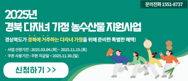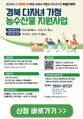 경북 다자녀가정을 위한 농수산물 지원 혜택을 확인하세요! 신청 방법, 지원 대상, 제공 품목 등 자세한 정보를 안내해드립니다. 선착순으로 빠르게 마감될 수 있으니 아래에서 바로 신청하시기 바랍니다.