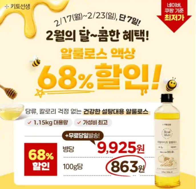 [온라인최저가] 2월의 달~콤한 혜택! 대용량 알룰로스 액상 68% 할인 & 병당 9,925원 네이버, 쿠팡 기준 최저가 100g당 863원! 무료당일발송까지 당류, 칼로리 걱정 없는 건강한 설탕대용 알룰로스! 설탕보다 더 맛있고 달콤한데 건강한 1.15kg 대용량 알룰로스로 더욱 OOOOO 즐겨보세요! OOOOO은 무엇일까요?
