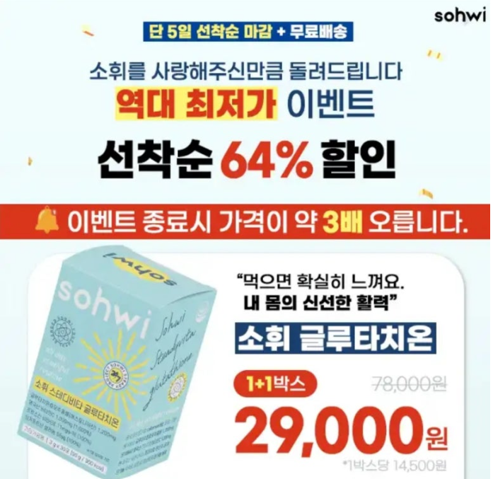 단5일 수량비상 "다들 얼굴에 뭐 했냐고 물어요. 그냥 이거 먹었을 뿐인데" 성분 꼼꼼히 챙기는분들이 선택하는 소휘 글루타치온! 불필요한 컨셉원료 없이 유해산소로부터 세포를 보호하는데 도움을 주는 비타민C, 비타민E,000 그리고 글루타치온 구성성분인 L-시스틴까지 핵심으로 꽉 채운 소휘 글루타치온! 하루 1포로 활력 관리 끝! 여기서 000은?