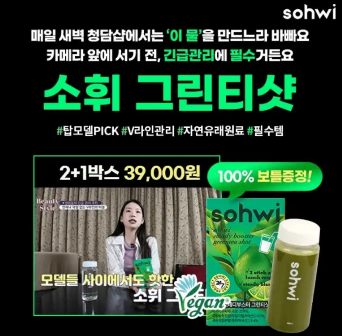 중요한 촬영 전 아침에 탑모델은 '이 물'을 마시느라 바빠요. 준비안된 얼굴도 또렷하게 살려주거든요 수량비상 50만 다이어터 후기대란템 소휘 그린티샷은 단10kcal, 당류1g미만! 0000 핵심성분 유기농녹차의 카테킨은 해외 셀럽들의 건강한 몸매 유지 비결이며, 세계 10대슈퍼푸드로 폴리페놀이 풍부해요. 물마시든 쉬운 관리! 여기서 0000는?
